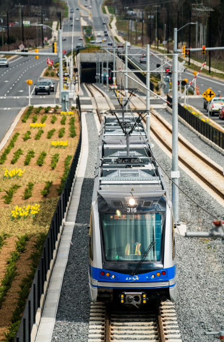 The Blue Line LRT is the Charlotte region's first LRT service. It is 18.9 miles long and extends from I-485 at South Boulevard to UNC Charlotte’s main campus. A four-mile stretch of the new extension that connects Old Concord Road and UNC Charlotte main campus, through North Tryon St median, is shown in map.