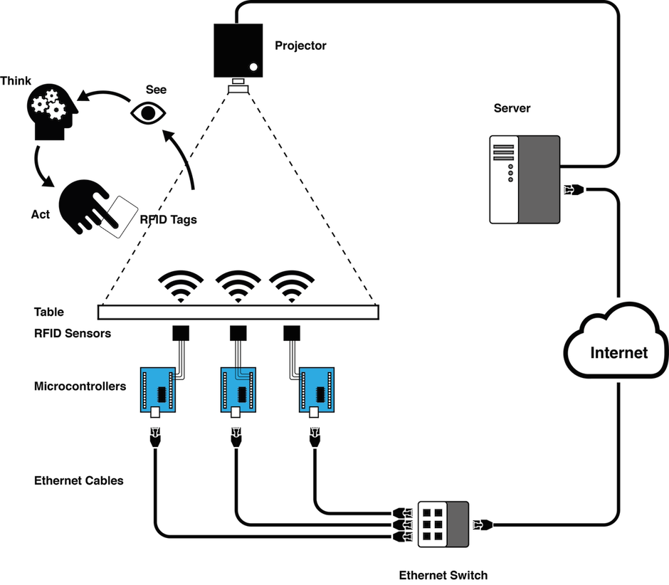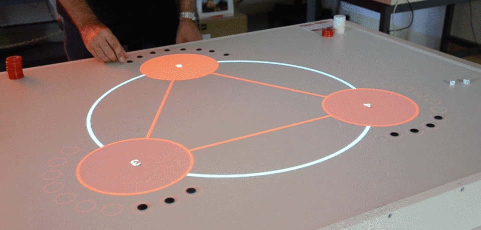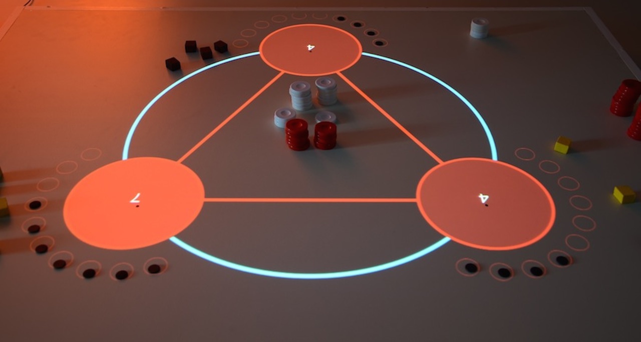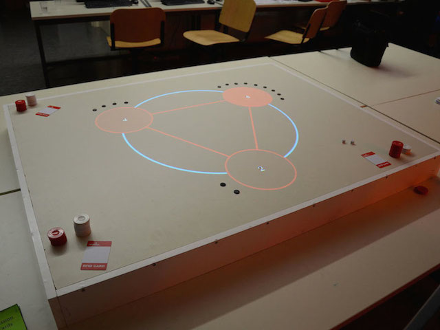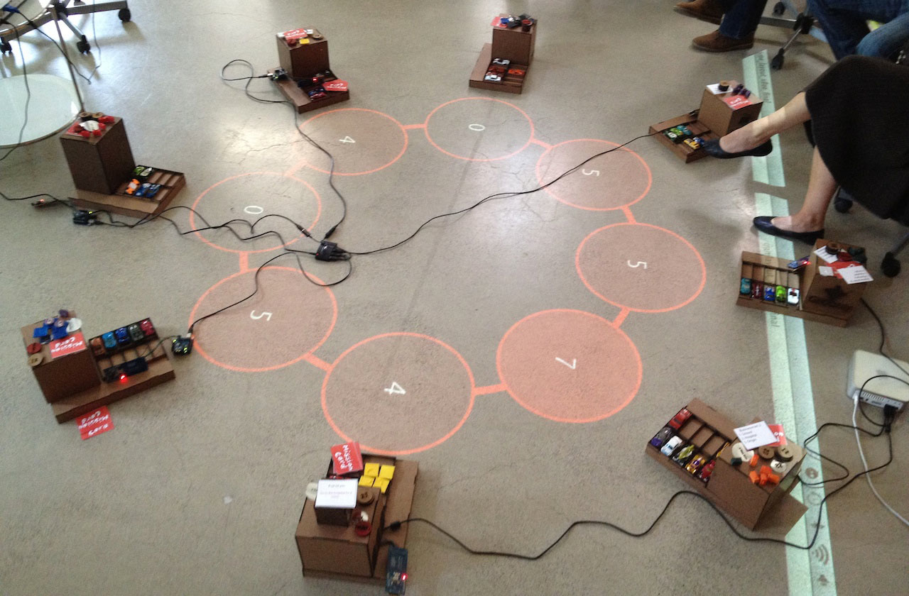 All players must collaborate to win more points. The employed technology uses an array of RFID sensors mounted underneath the board surface to track pick-ups and drop-offs. Each sensor connects to the Internet through an Arduino microcontroller. Each time a player taps an RFID tag on a station, it sends a message to a central computer, which updates a pricing visualization scheme. The visualization is projected back to the surface informing the players about the payoffs of their options, closing the game's feedback loop.