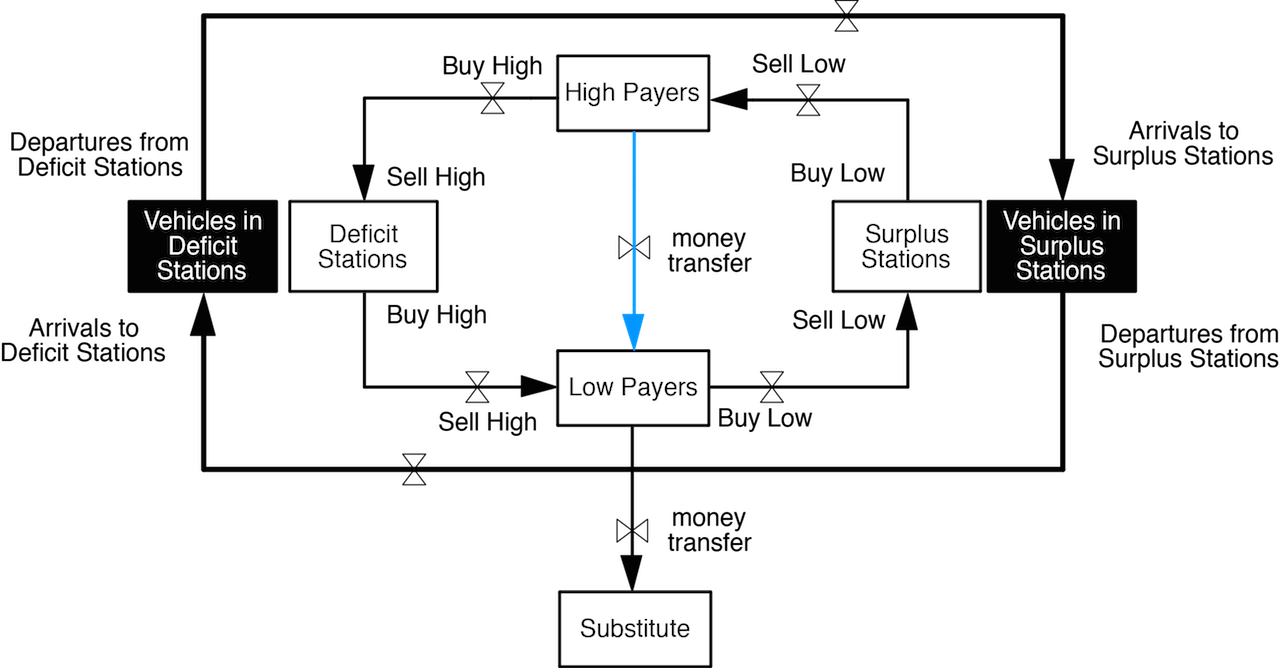 The game resembles a city consisting of interconnected neighborhoods, each with a limited number of parking spaces and vehicles. Commuters can move between blocks by a MoD vehicle, public transit, or any combination of the two. Commuters use both time and money to travel however each commuter starts with a different mix of those two resources based on her profile. Each transportation mode consumes different mix of time and money units per trip. Commuters earn points by accomplishing origin-destination missions while the banker each time a MOD vehicle is used. The more trips commuters make using MOD vehicles the more the money circulates in the game. If players and banker do not cooperate then money flows out of the economy till everyone runs out of resources. Players must use wisely their available resources to earn as many points as possible: the commuters by selecting bundles of MOD and public transit trips, while the banker by selecting prices that attract commuters. Winner is the player with the highest score at the end of the game. For the pricing we used a scenario of a two-sided market competing station-traders: commuters buy vehicles from origin stations and resell them to destination stations paying the difference of those two transactions which can thus be positive, zero, or negative (rewarding).