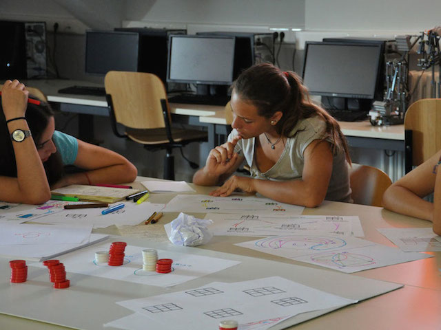 During the workshops, students work collaboratively in four teams: The first team designs the layout and the rules of the game, finding tangible ways to represent parameters that affect decision-making, like money and time. The second team develops the electronic infrastructure for sensing pickups and drop-offs and sending messages to a remote computer. The third team programs the computer to receive those messages, estimate prices, and visualize prices back to the board game to influence the decisions of the players. The fourth team develops a computer-simulated version of the game that is then used as a comparative means.