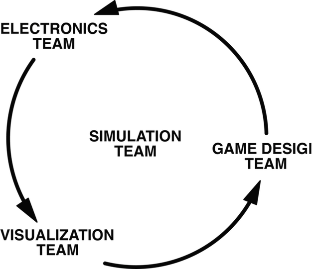 Due to task interdependence none of the teams could work without the feedback of the others. For example, game design depended on the technology of the technical teams while their decisions depended in turn on the concept of the game design. Furthermore gameplay decisions had to be simple enough so that the simulation team could model them and so forth.