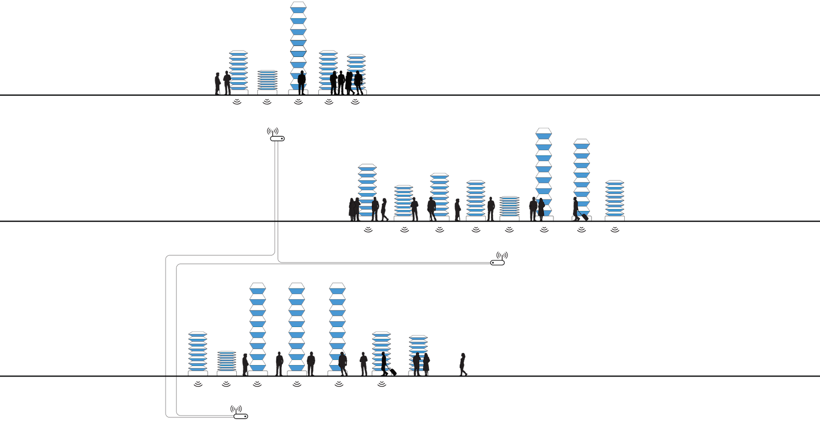 Previous research on object-based telepresence focuses on one-on-one interactions. We extend this discourse to a many-on-many perspective, asking the question: How might the built environment mediate collective interactions in large urban participatory systems? Pneuxels allows humans, objects and places to connect similarly to how a chat application allows online participants to converse.